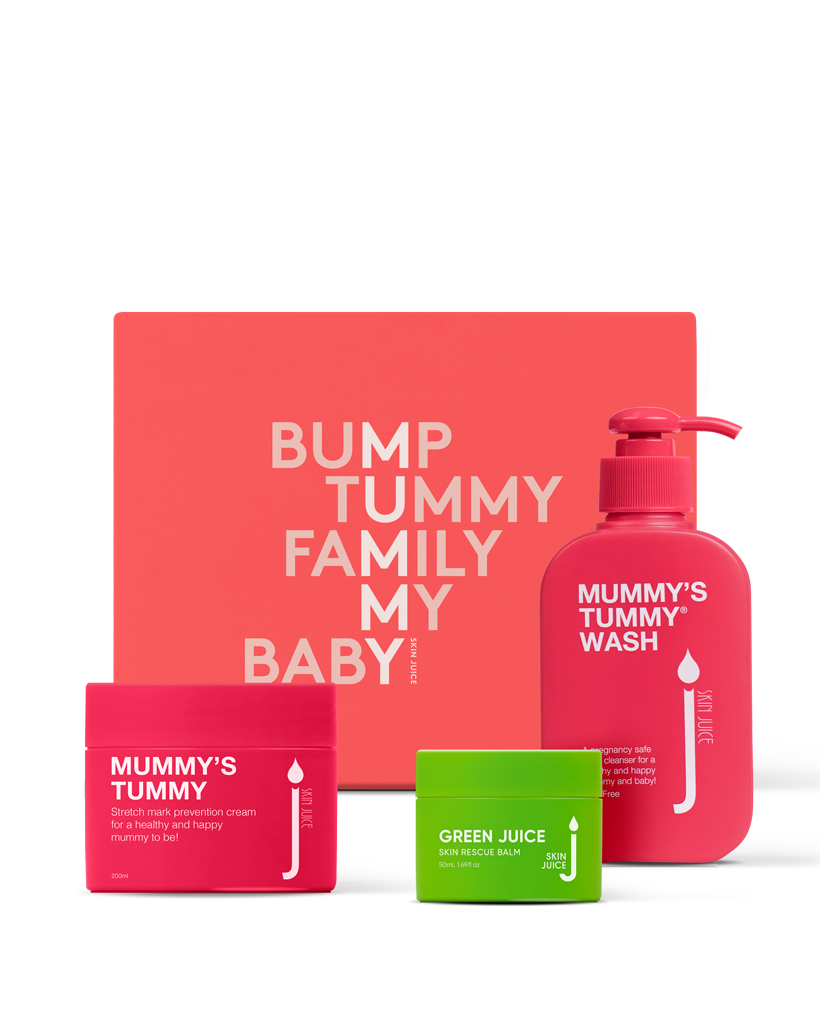 - Mummy’s tummy stretch mark prevention cream: Massage in this buttery cream to support and comfort skin prone to stretching during pregnancy, including the tummy, bust, hips and thighs. - Mummy’s tummy wash: Use before stepping into the shower. Warm in fingers and massage onto dry skin. Rinse to remove. - Green juice skin rescue balm: This healthy skin recovery balm will soothe, soften and condition the skin anywhere on the face or body and is safe to use on anyone from 4 weeks old.